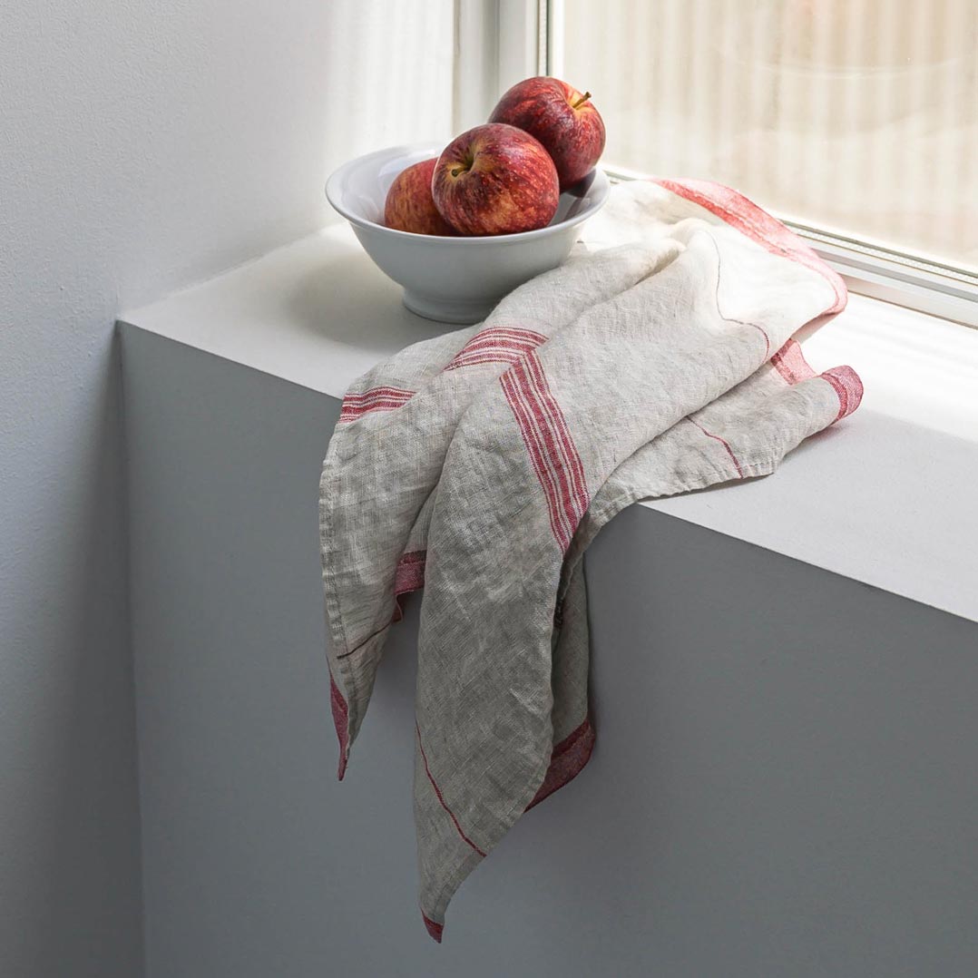 Our kitchen towels, made of washed pure linen, are thick and tough enough for daily use, while fitting softly on the hands. Water absorbability of linen is higher and dries faster than cotton, so it’s suitable for sanitary situations such as in the kitchen.