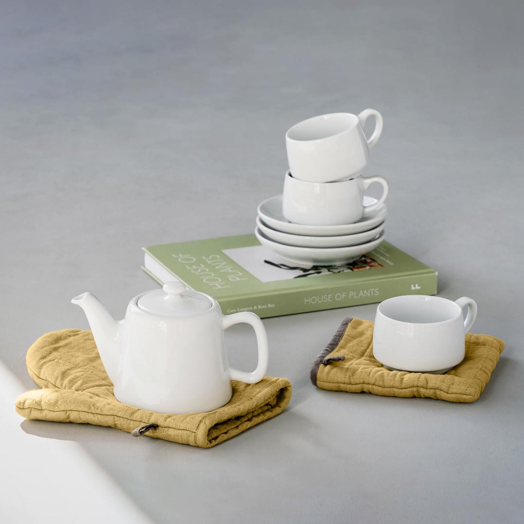 This season introduces the Antique Yellow color to aprons, kitchen linens, and hats.