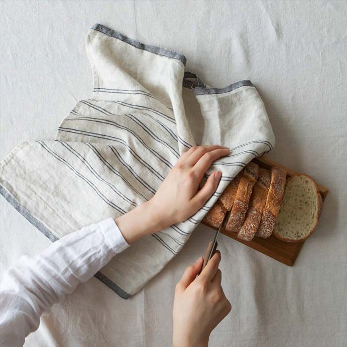 Une nouvelle serviette de cuisine « Jumelles » aux lignes bleues pâles se marie parfaitement à votre table. Vous pouvez trouver plus d’une centaine de couleurs et de motifs de serviette de cuisine sur nos catalogues.